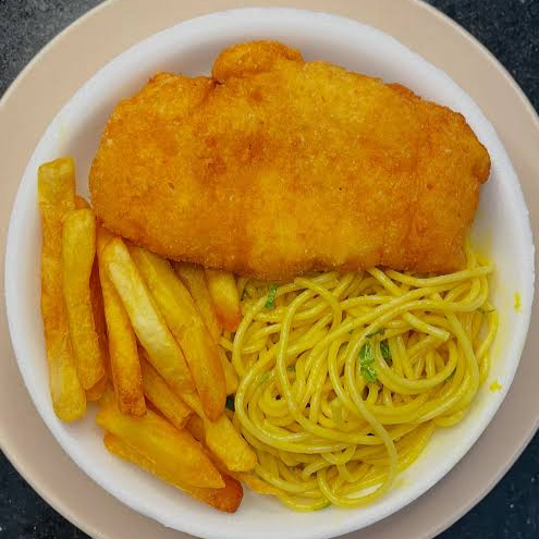 Filé De Frango Empanado, Macarrão E Batata Frita