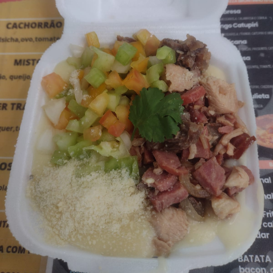 Purê De Aipim Com Calabresa E Frango Acebolado, Parmesão E Batata Palha