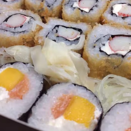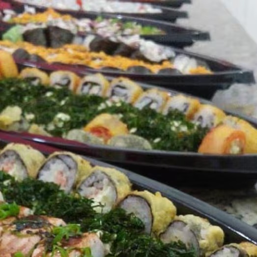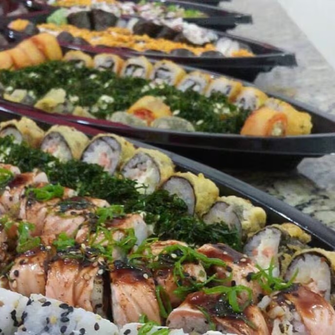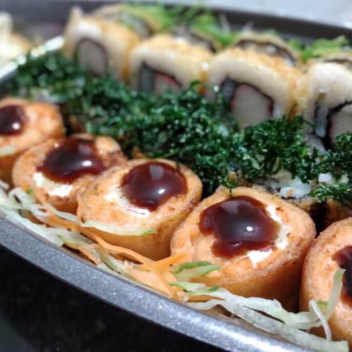 10 hot Filadélfia, 10 uramaki salamao grelhado, 10 Hossomaki kani cheese, 10 Hosso camarão croc.