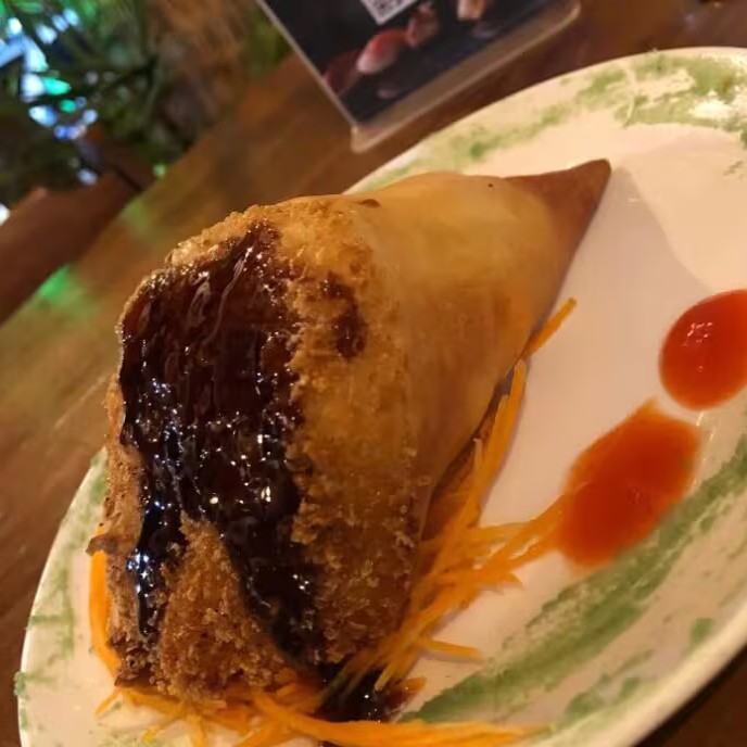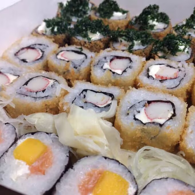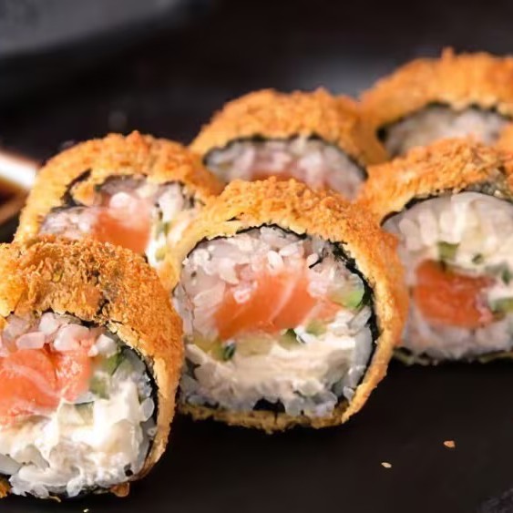 Roll de alga marinha com recheio de arroz japonês, salmão e cream cheese.empanado na farinha panko.