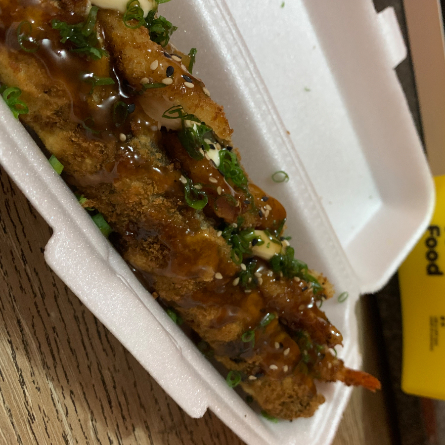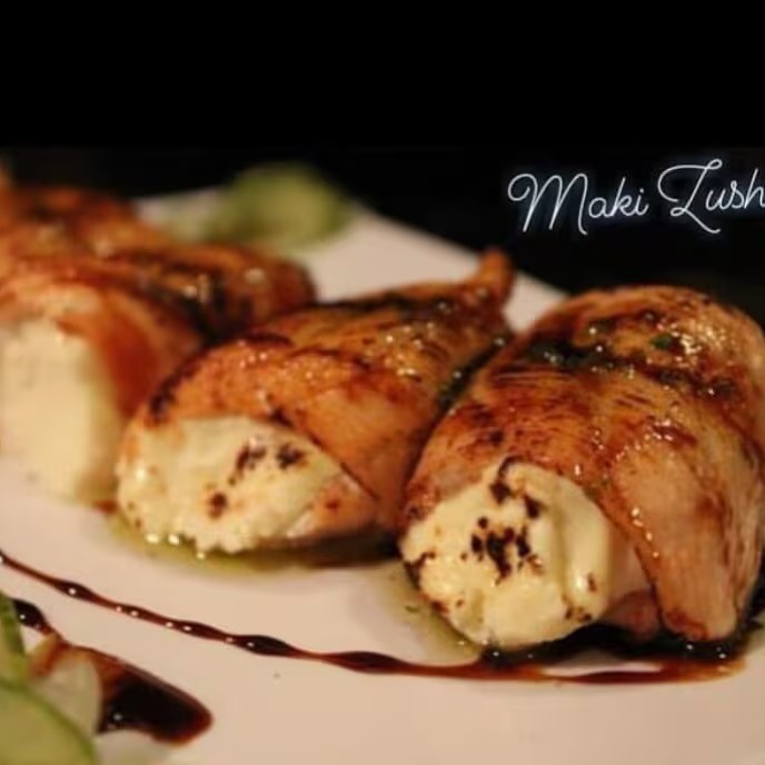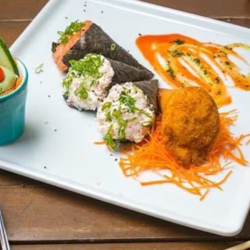 Envolto de lamina de salmão flambado com receheio de camarão e cream cheese, regado ao molho tarê,cebolinha e gergelim.