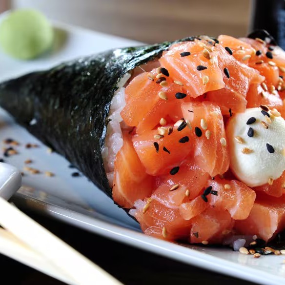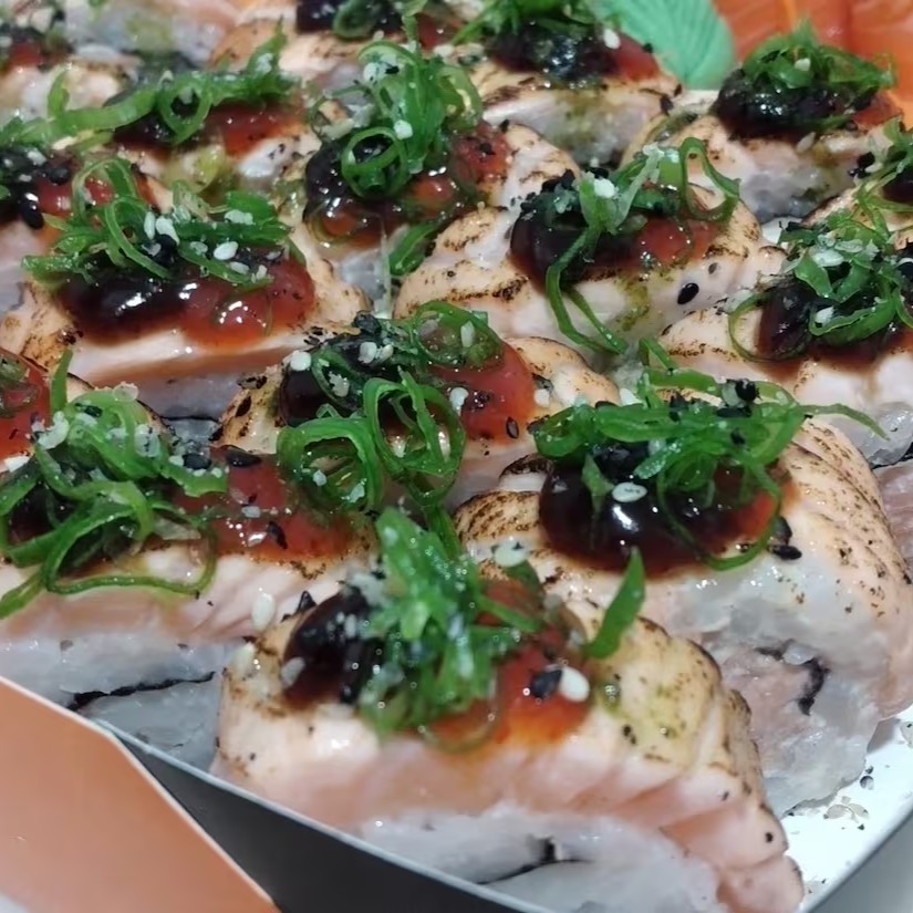 Roll de alga, arroz, salmão e cream cheese, coberto com lâmina de salmão Macaricado, regado ao molho tarê, cebolinha e gergelim.