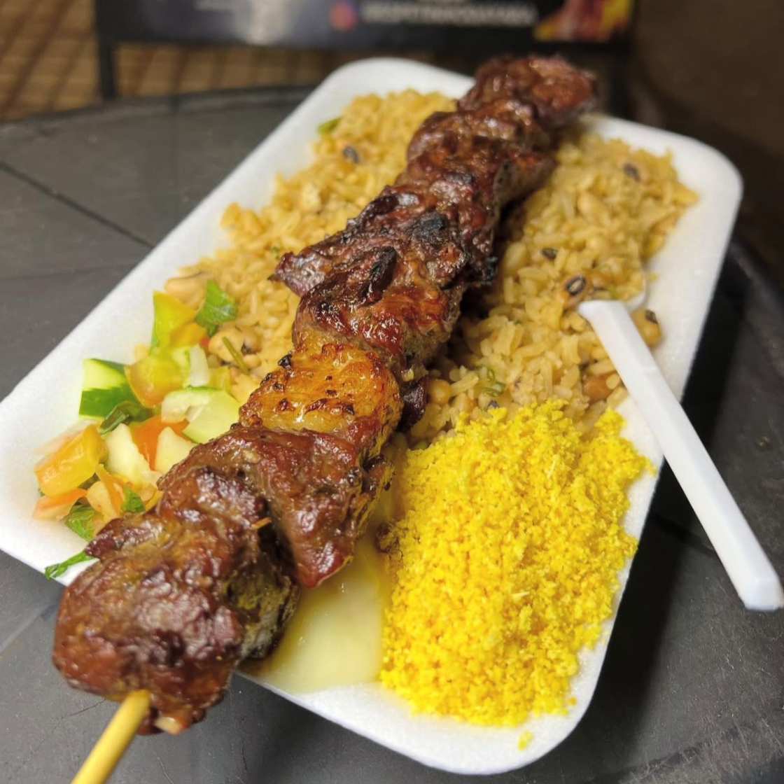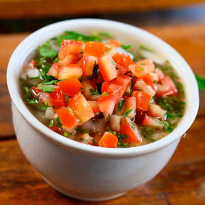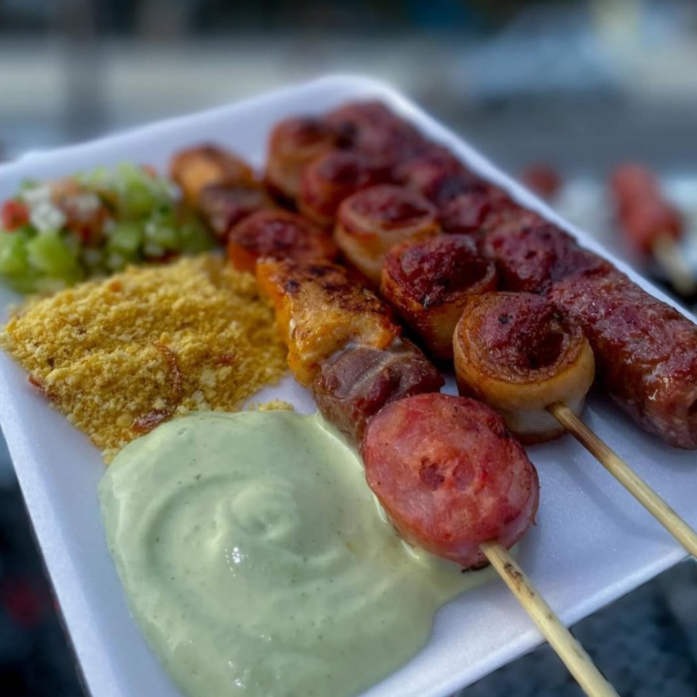 4 Espetos + salada vinagrete + farofa + 2 Refrigerante em lata