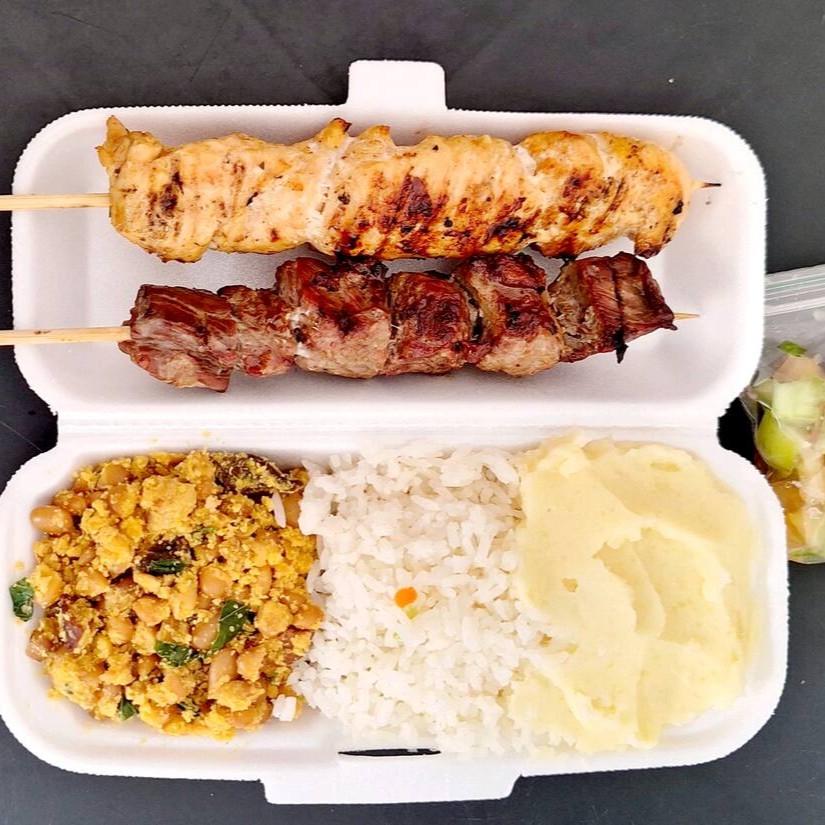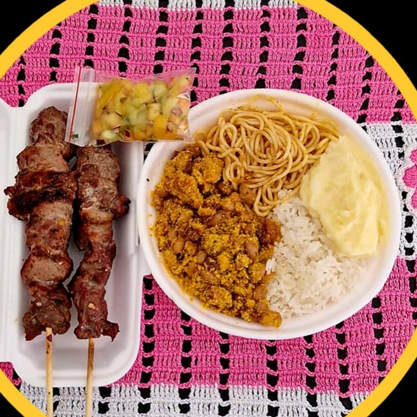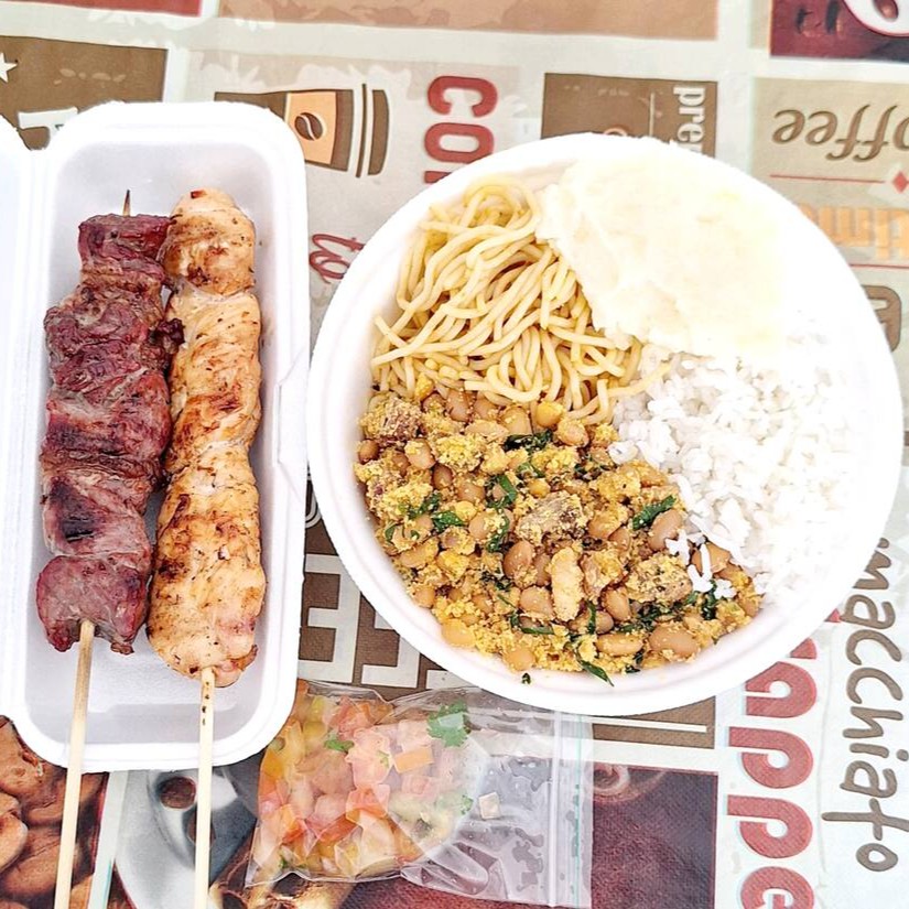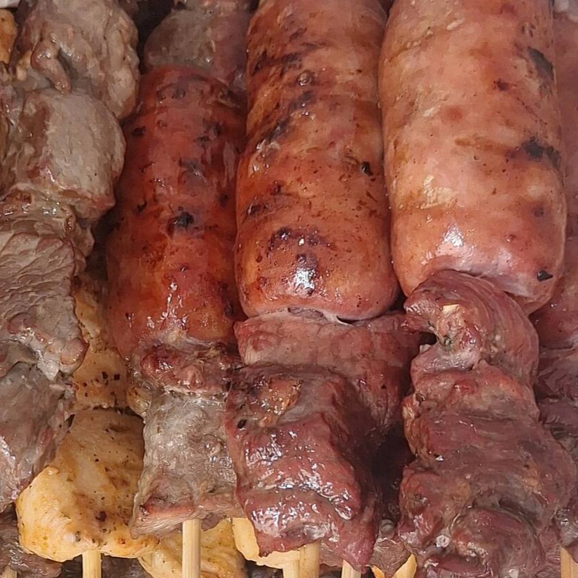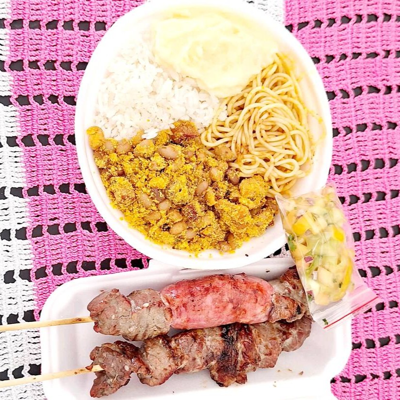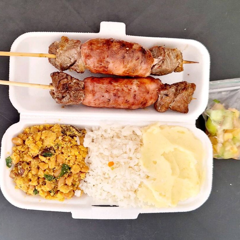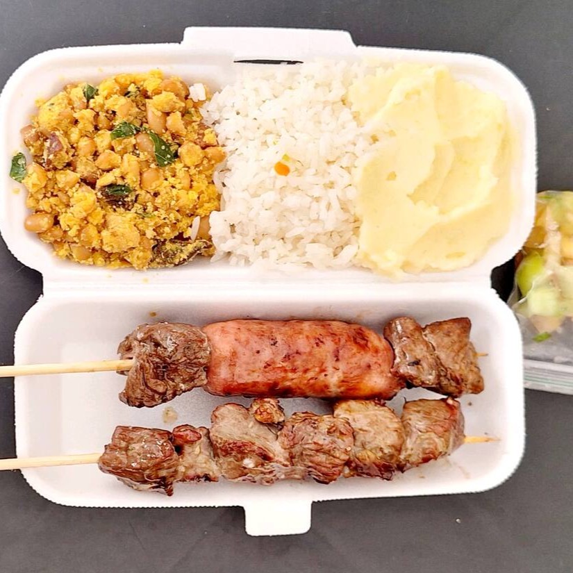 1 Churrasquinho de Alcatra, 1 Churrasquinho misto, Toscana e carne cuidadosamente grelhado, para trazer o sabor autêntico do churrasco. , feijão tropeiro, arroz, vinagrete, purê de batata. OBS: não substituímos itens.