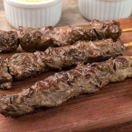 2 Espetinho de Alcatra cuidadosamente grelhados para trazer o sabor autêntico do churrasco. , Farofa especial, Vinagrete.