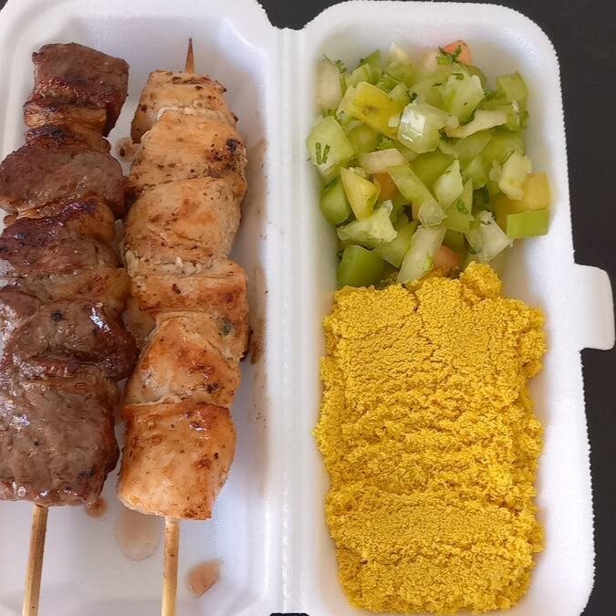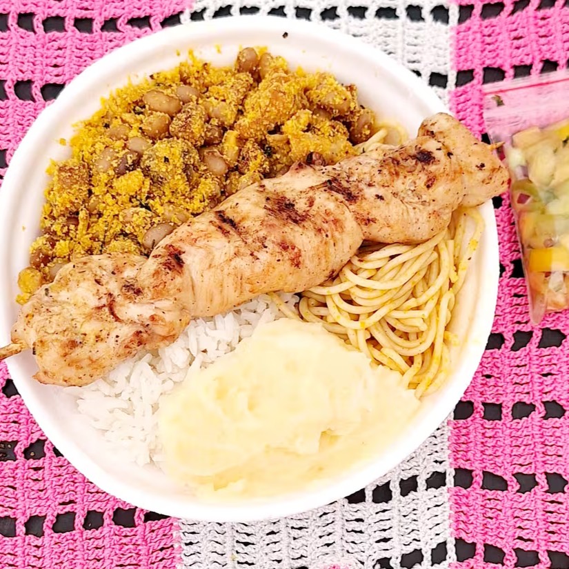 1 Churrasquinho de alcatra 120gr e 1 Churrasquinho 130gr filezinho de frango sassami cuidadosamente grelhados , feijão tropeiro (tipo carioca), arroz e salada, purê de batata. OBS: não substituímos itens.