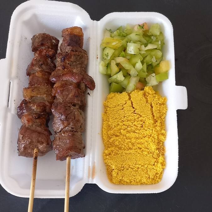 1 Churrasquinho Misto, 1 Churrasquinho de Alcatra cuidadosamente grelhados, feijão tropeiro, arroz e salada. purê de batata. OBS: não substituímos itens.
