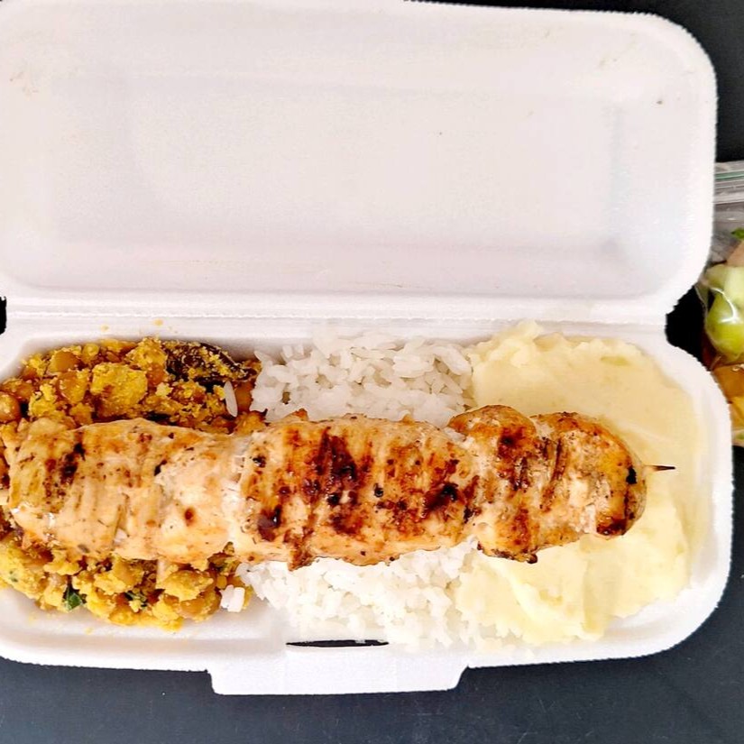 1 Churrasquinho 130gr, filezinho de frango sassami cuidadosamente grelhada, feijão tropeiro, arroz e vinagrete, purê de batata. OBS: não substituímos itens.