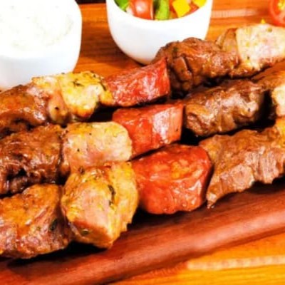 Espetinho Misto Completo Uma combinação irresistível de carne bovina suculenta, frango macio e toscana saborosa, tudo grelhado no ponto perfeito. Acompanha 150g de farofa crocante e 150g de vinagrete fresquinho, preparados na hora para realçar ainda mais o sabor. Uma opção completa, saborosa e ideal para matar a fome com qualidade!