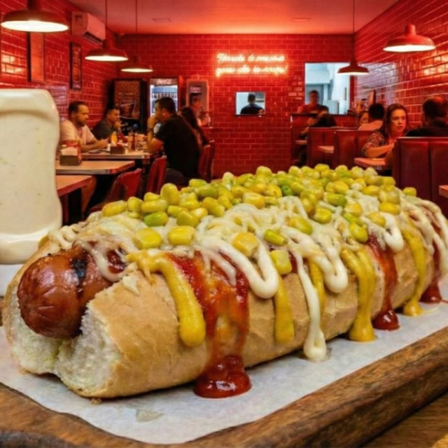 Pão 30cm, Molho De Tomate Artesanal, 2 Salsichas, Ketchup, Maionese, Mostarda, Maionese Verde, Milho Verde, Barbecue, Queijo Ralado E Batata Palha - Imagem meramente ilustrativa - (Gerada por IA)