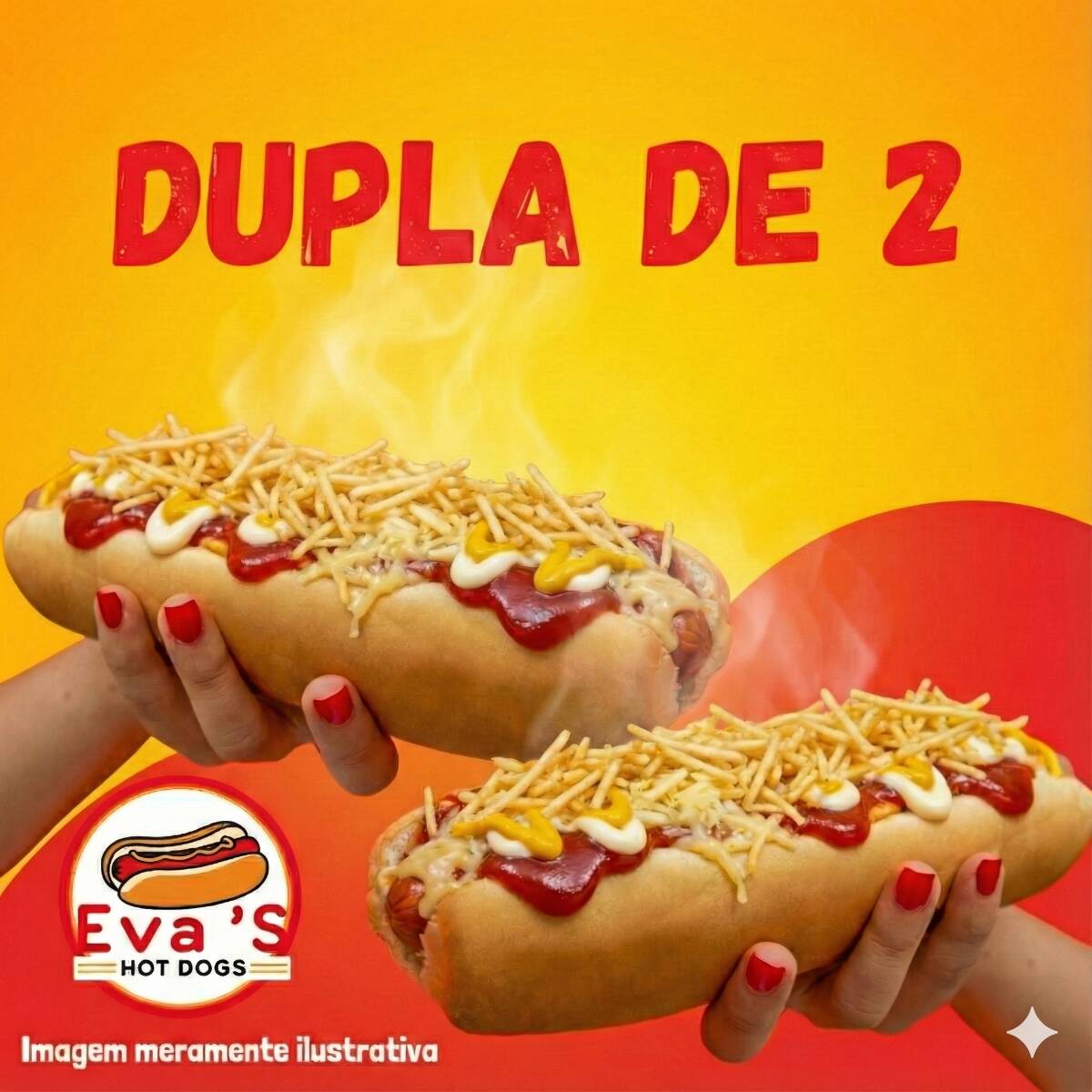 O Combo 'Dupla de Dois' é a escolha perfeita para os amantes de cachorro-quente. Composto por 2x Superdogs incrivelmente suculentos. Cada Superdog vem com um pão 30cm extremamente macio e um delicioso molho de tomate artesanal. Saboreie duas salsichas suculentas, generosamente cobertas com molho Barbecue, ketchup, maionese e mostarda, e finalizadas com queijo ralado e batata palha crocante - Imagem meramente ilustrativa - (Gerada por IA)