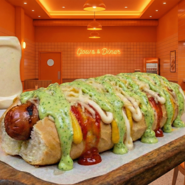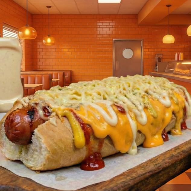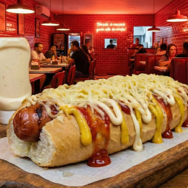 Pão 30cm, Molho De Tomate Artesanal, 2 Salsichas, Ketchup, Maionese, Mostarda, Maionese Verde, Barbecue, Queijo Ralado E Batata Palha - Imagem meramente ilustrativa - (Gerada por IA)