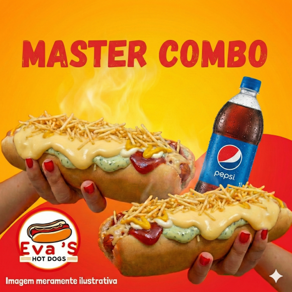 2x MASTER DOG (Pão de 30cm, molho de tomate artesanal, 2 salsichas, ketchup, maionese, mostarda, maionese verde, barbecue, cheddar cremoso, molho picante, queijo ralado e batata palha) + Refri 1Litro