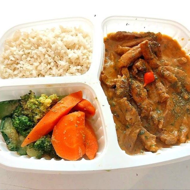 Delicioso estrogonofe de carne ao molho rosé artesanal. Acompanha arroz integral e legumes refogados (brócolis, cenoura e abobrinha).