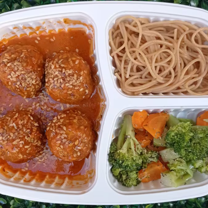 Almôndegas artesanais de carne ao molho pomodoro artesanal. Acompanha espaguete integral e legumes salteados
