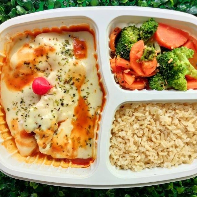 Filé de frango ao molho de tomate artesanal e queijo muçarela. Acompanha arroz integral e legumes refogados (brócolis, cenoura e abobrinha).