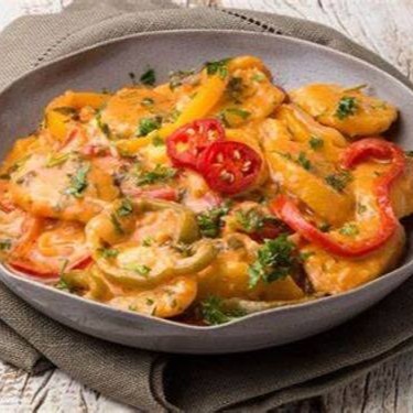 Delicioso estrogonofe de frango ao molho rosê artesanal. Acompanha arroz integral e legumes refogados (brócolis, cenoura e abobrinha).