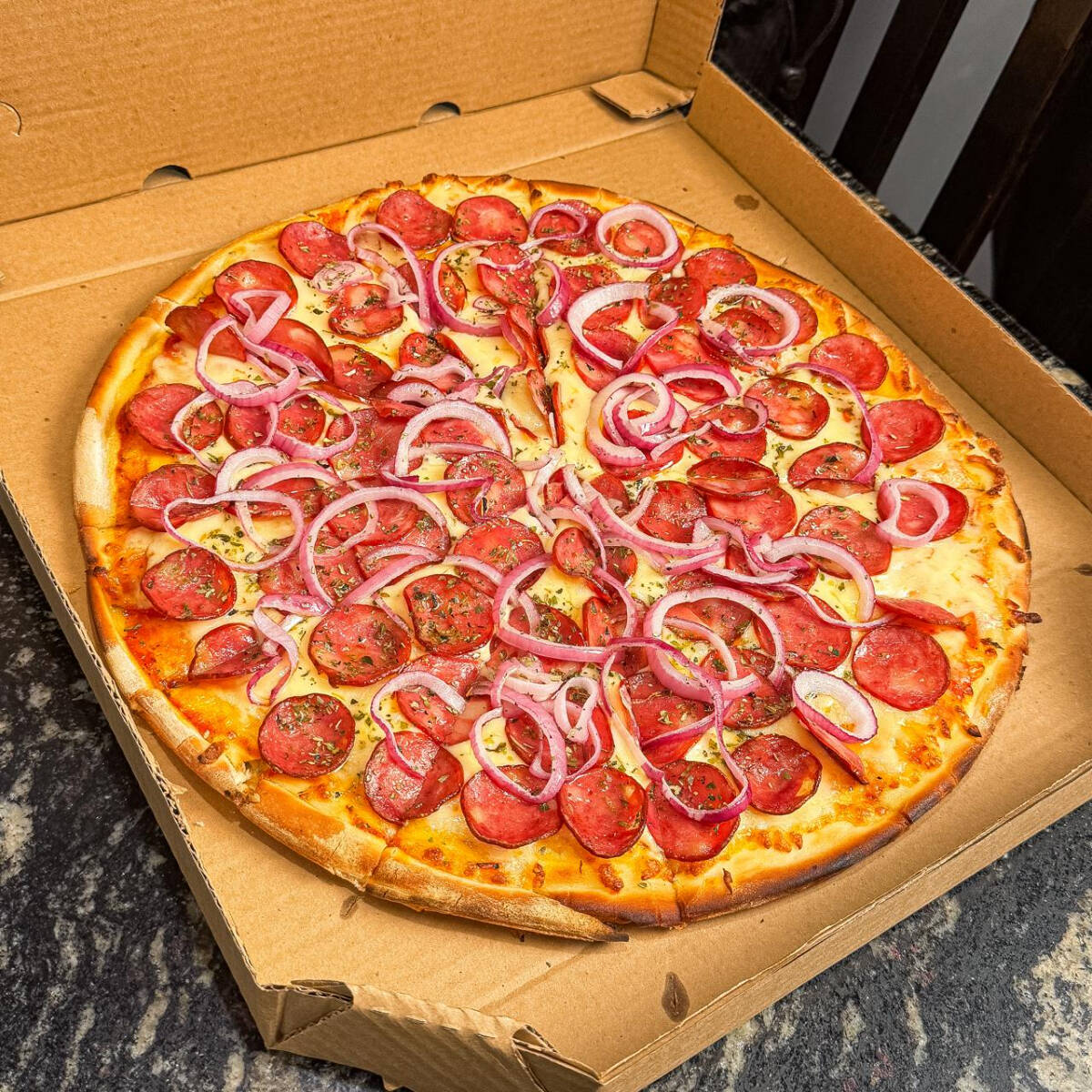 Molho artesanal de tomate, mussarela, calabresa, cebola e oregano