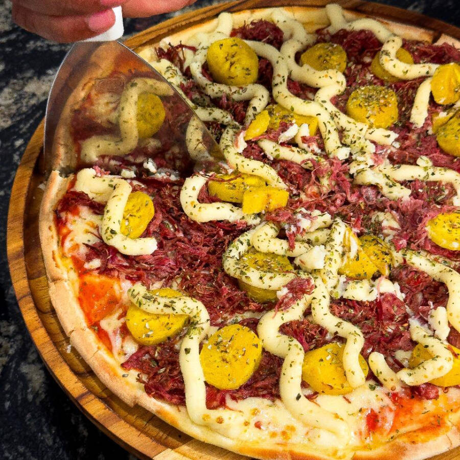 8 fatias, mussarela, charque, banana da terra e catupiry