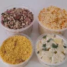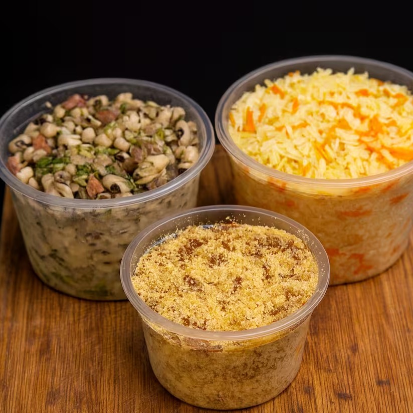 Este é o Kit de Acompanhamentos perfeito para sua refeição. Nele, você encontrará uma porção generosa de feijão fradinho, delicadamente cozido e servido em um pote de 500ml. Acompanha também um irresistível arroz aromatizado com cenoura, que traz um toque de cor e sabor, servido em um pote de 500ml. Para os amantes de bacon, preparamos uma farofa crocante e saborosa, enriquecida com cebolas douradas e servida em um pote de 250ml. Para completar nosso kit, temos uma salada de batata, cremosa e bem temperada com maionese, servida em um pote de 250ml. Tudo isso pensado para proporcionar uma experiência gastronômica completa e prazerosa.