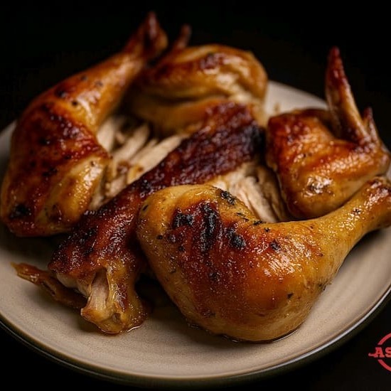 Apresentamos o nosso 'Frango Assado Especial', carinhosamente apelidado de 'Frango Atropelado'. Este prato é meticulosamente preparado, já que o frango é servido inteiramente cortado, facilitando a degustação. A carne é marinada com ervas finas e vinho de alta qualidade durante três dias, uma técnica que confere uma suculência sem igual ao prato. O resultado é um frango assado incrivelmente macio, com uma explosão de sabores que dançam no paladar. Um prato especial para momentos especiais.