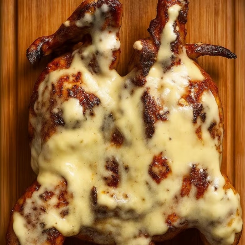 Esse delicioso frango maçaricado . Uma explosão de sabor esse queijo provolone maçaricado com uma pitada de orégano .