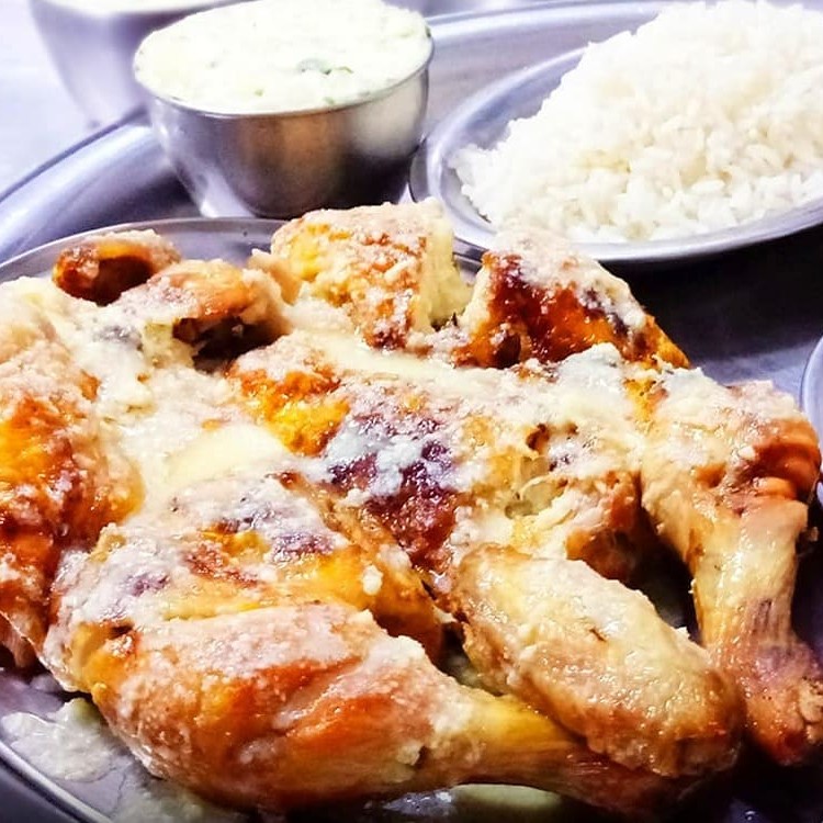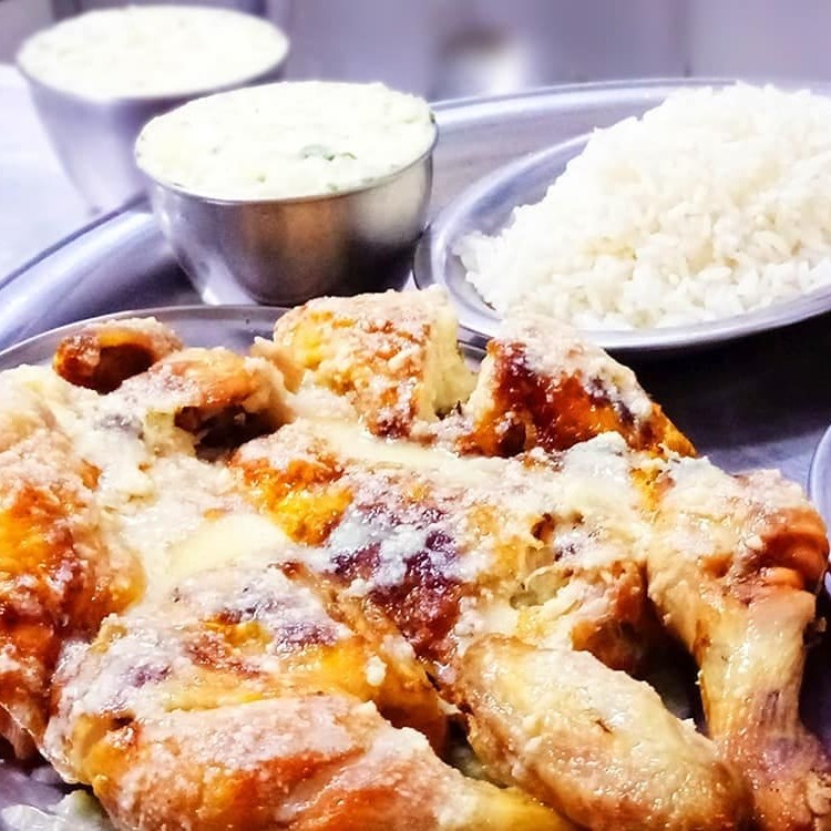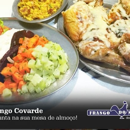 A verdadeira definição de Ideal para seu almoço: Frango Inteiro com molho de queijo parmesão e manteiga + Arroz branco soltinho, feijão tropeiro feito com charque, calabresa e bacon e nossa salada de maionese com Hellmann's - A Original!