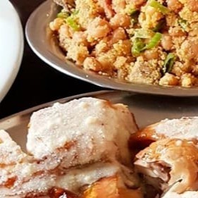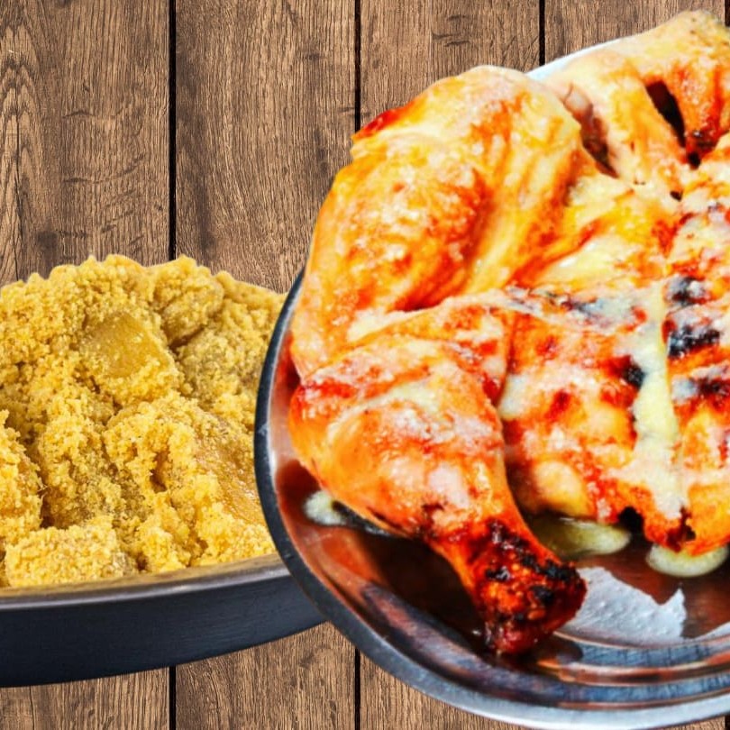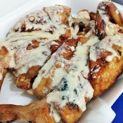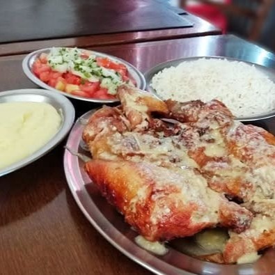 Frango inteiro assado na brasa servido com molho de queijo parmesão e manteiga + Arroz branco soltinho, feijão tropeiro, farofa de miúdos de frango, vinagrete, saladinha de legumes cozidos e maionese de batatas com Hellmann's