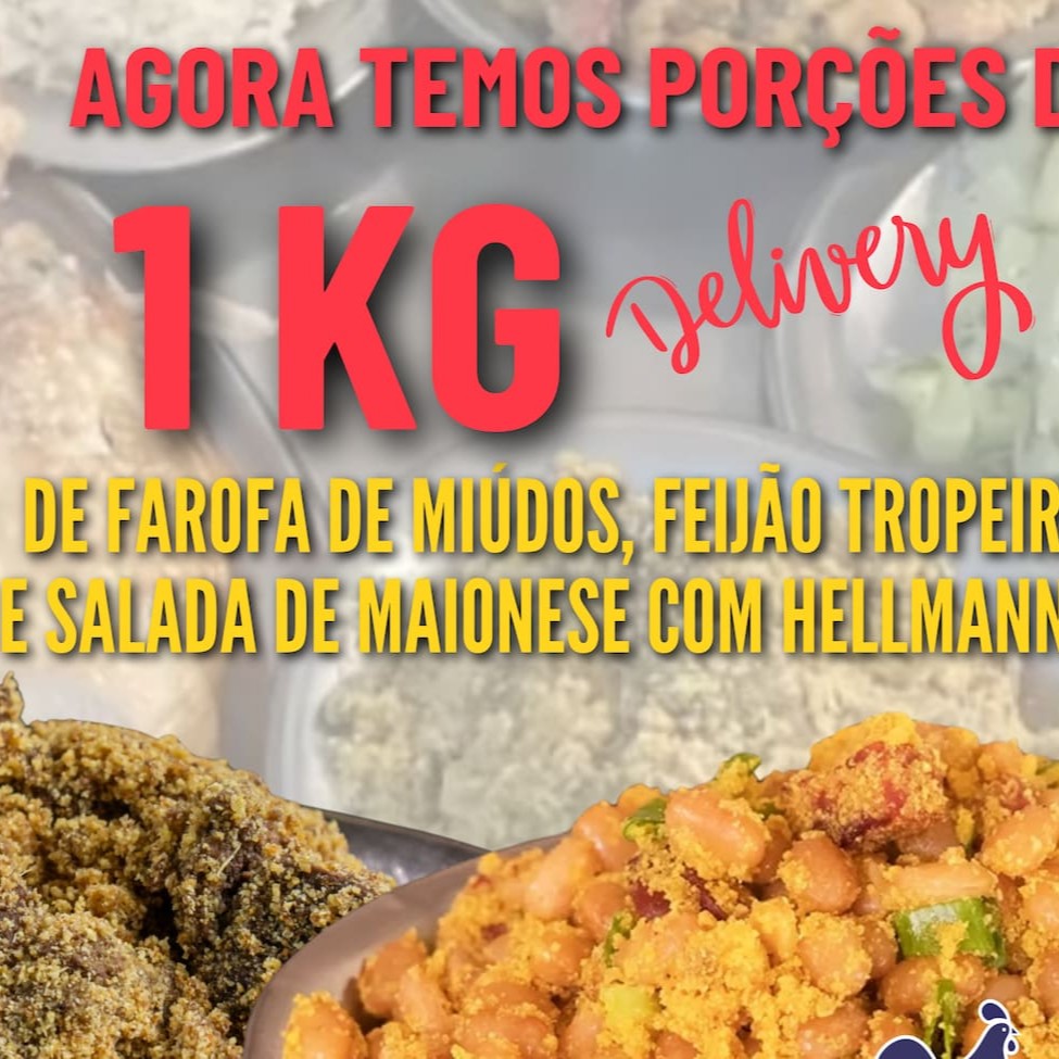 Perfeito para o almoço de família! Serve de 6 a 8 pessoas! 2 frangos inteiros com molho de queijo parmesão e manteiga + 1kg de feijão tropeiro com receita exclusiva + 1kg da famosa farofa de miúdos + 1kg da salada de maionese com Hellmann's!