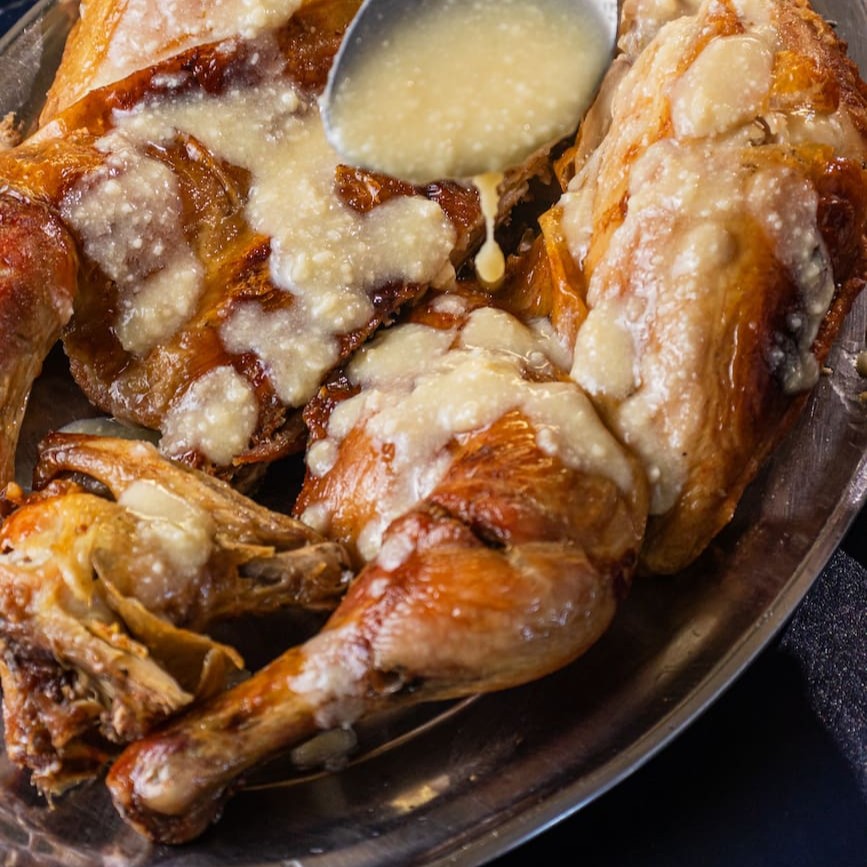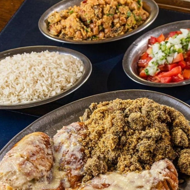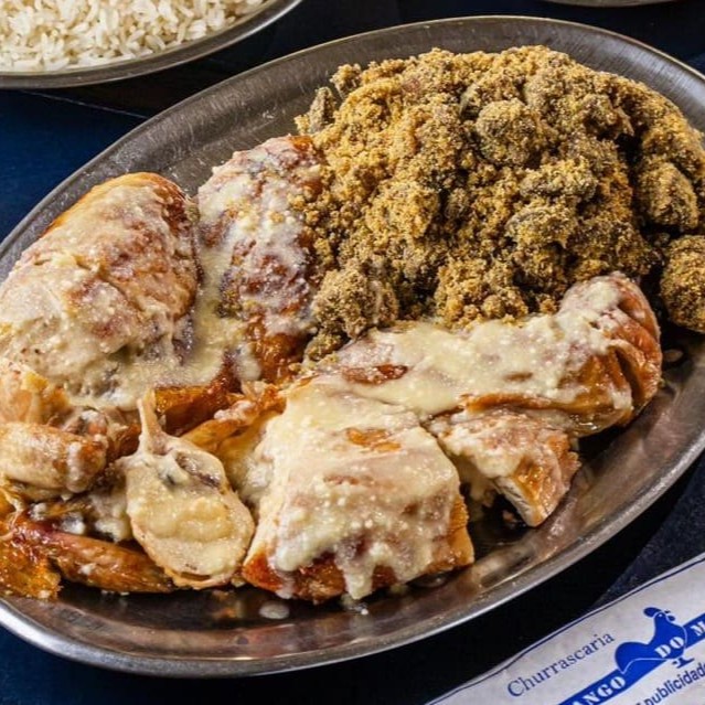 Frango inteiro servido com molho de queijo parmesão e manteiga acompanhado de feijão tropeiro e farofa de miúdos