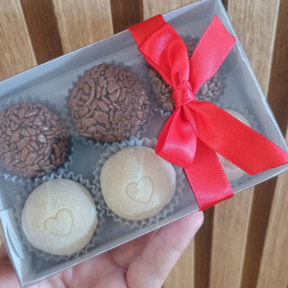 Caixa presenteável com seis brigadeiros (3 de chocolate e 3 de ninho)