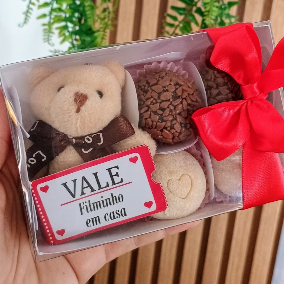 "Linda opção para presentear quem você ama! Essa caixinha personalizada acompanha um chaveirinho de ursinho bem fofinho + 4 brigadeiros (dois de Ninho e dois de chocolate 50% cacau). Acompanha também 2 ""Vales"" para surpreender o seu amor. *Escolha o vale e a cor do seu ursinho preferido ou serão escolhidos aleatoriamente. Tags Presente, amor, te amo, especial pra você, Dia dos namorados, com amor, com carinho, para meu amor, para presentear, namoro, namorada, esposa, mulher, mãe, Valentine day, surpresa, ursinho, chaveiro, Dia especial, surpresa."