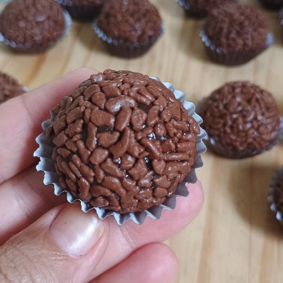 Massa amanteigada com recheio de creme de chocolate meio amargo, decorado com granulado e mini brigadeiro