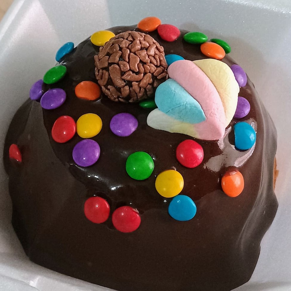 Deliciosa massa amanteigada e molhadinha a sua escolha (Baunilha ou Chocolate), todo coberto com recheio de creme de chocolate 50%. E para decoração utilizamos um mini brigadeiro, marshmallow e confetes coloridos. Bolo de 12cm, serve até 2 pessoas.