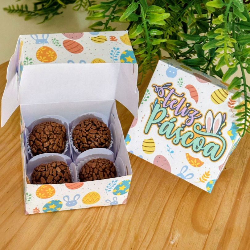 Caixinha personalizada com tema de páscoa, acompanha quatro deliciosos brigadeiros de chocolate 50% cacau