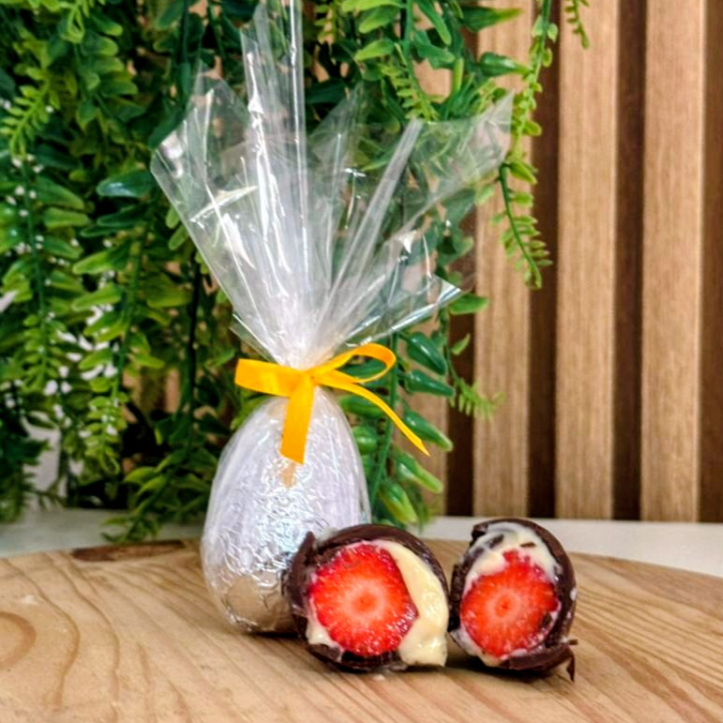 Utilizamos chocolate fracionado top meio amargo para fazer as casquinhas dos ovinhos e recheado com creme de ninho e morango fresco. Ovinho tamanho 50gr