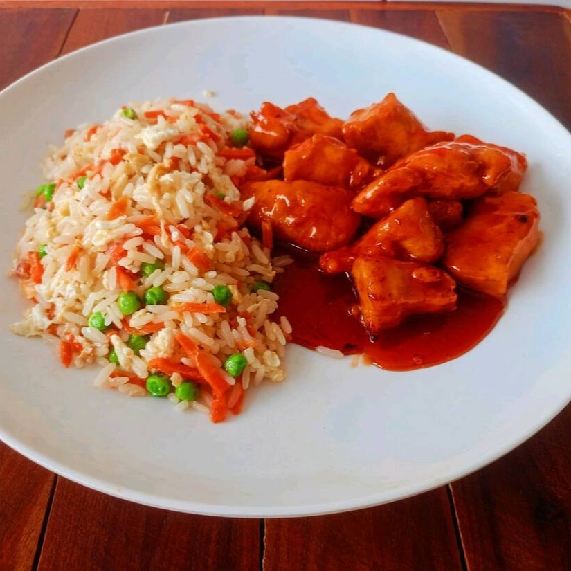 Frango imperial 400 gm + Arroz Chop Suey 400 gm. o frango imperial é levemente apimentado com o molho imperial feito de laranja .