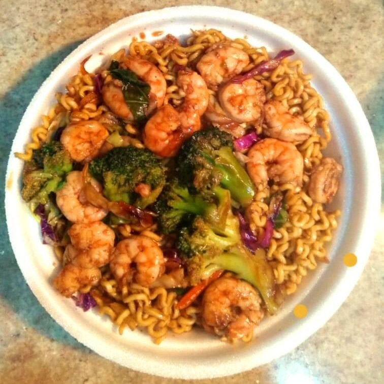 Yakisoba delicioso com camarão com um quilo.