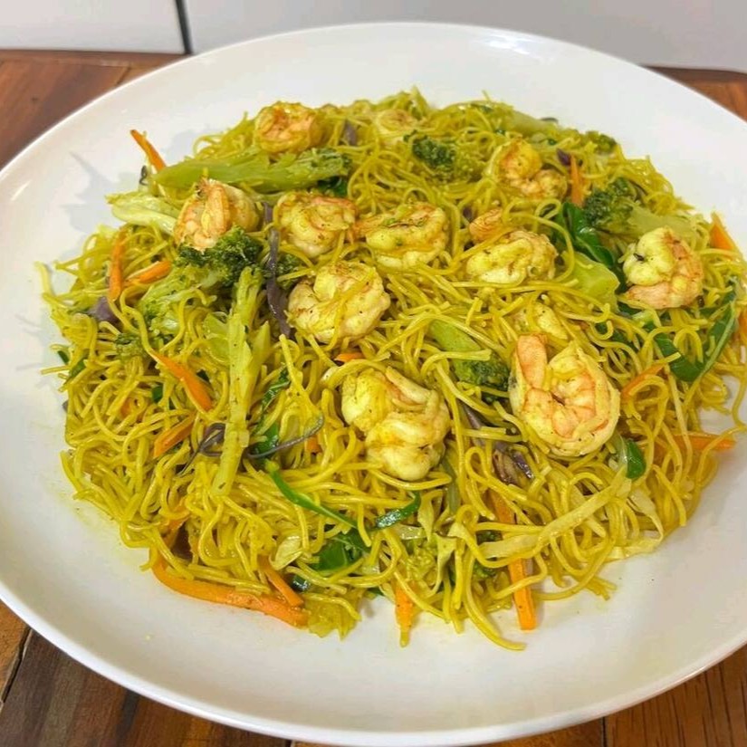 Bifum com camarão 500g vai massa de macarrão de arroz com legumes brócolis repolho cenoura couve e camarão.