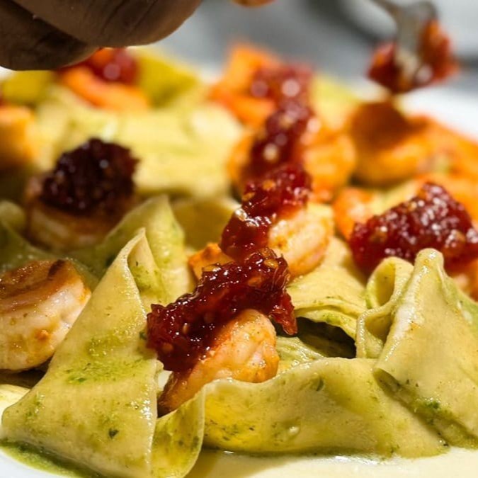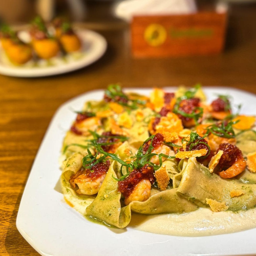 Para vocês, que merecem uma noite especial: pappardelle fresca, feita à mão, envolta em um molho cremoso de quatro queijos que derrete na boca. E, como toque de luxo, camarões suculentos grelhados que elevam cada garfada a um momento de puro prazer. O equilíbrio é perfeito: a riqueza do molho encontra a delicadeza dos frutos do mar, enquanto a massa artesanal - macia e sedosa - une tudo em harmonia.