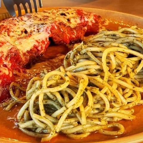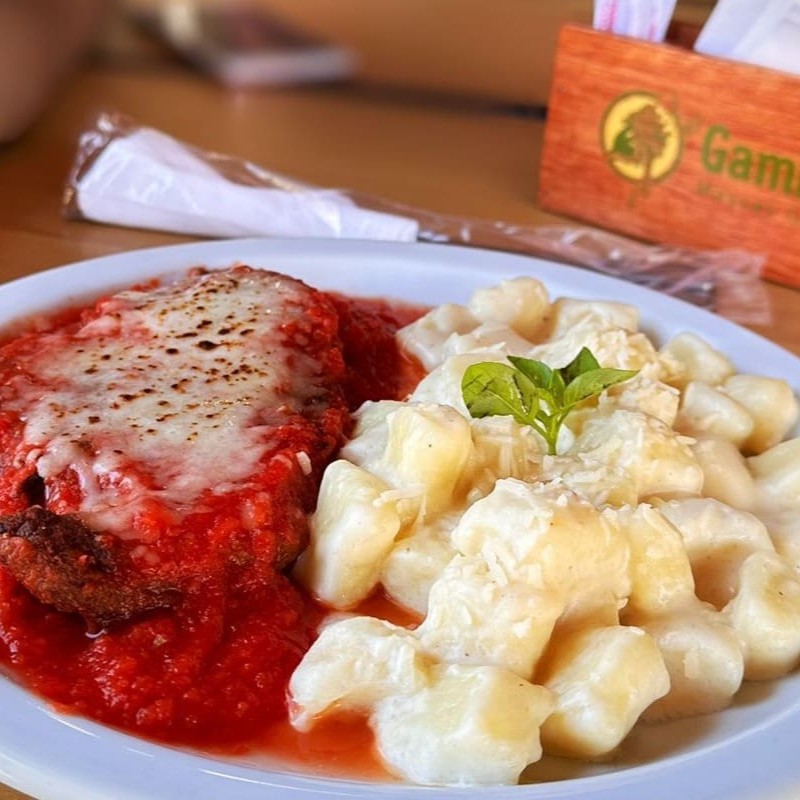 Saboreie um delicioso nhoque artesanal ao molho branco acompanhado por uma porção de 150g de suculento filé mignon à parmegiana, coberto com um autêntico molho de tomate caseiro e finalizado com muçarela gratinada.