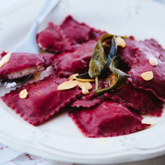 Experiencie nosso Ravioli Barbabietola, uma sublime massa fresca tingida com a vibrante cor da beterraba. Este prato é servido com um molho de castanhas robusto, intensamente aromático e de sabor inigualável. No interior de cada ravioli, encontrarás um recheio de parmesão fresco, que fornece um contraste suave e cremoso com a textura crocante das castanhas. Para finalizar, uma generosa porção de parmesão fresco é polvilhada por cima, criando uma camada extra de indulgência. Esta é uma verdadeira festa para os sentidos, digna de ser saboreada em cada garfada.