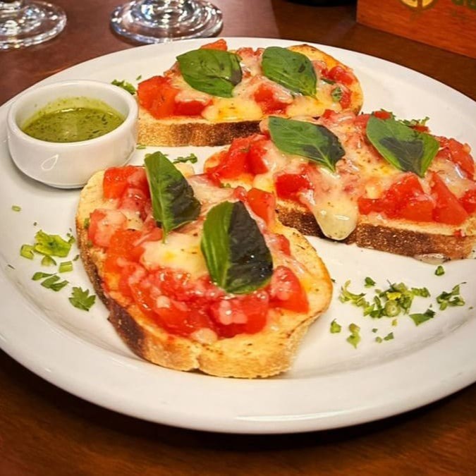 Apresentamos nossa deliciosa e autêntica Bruschetta Napolitana. Esta entrada é composta por suculentas fatias de pão italiano, cuja fermentação longa garante uma textura inigualável. Cobertas com nosso exclusivo molho pomodoro, feito em casa e repleto de sabor, elas recebem lâminas de queijo muçarela cuidadosamente gratinadas, proporcionando um toque cremoso e agradavelmente aconchegante ao prato. Coroando a bruschetta, encontram-se folhas frescas de manjericão, que adicionam um toque aromático e refrescante. O prato é acompanhado pelo nosso autêntico molho pesto, que proporciona um sabor extra e um acabamento requintado. Uma verdadeira experiência gastronômica italiana, perfeita para começar sua refeição em grande estilo.