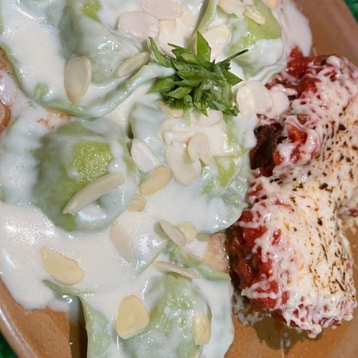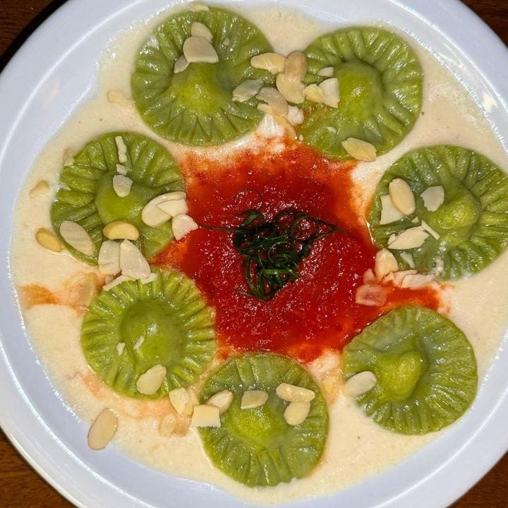 Massa fresca verde com recheio cremoso de três queijos, banhados ao molho branco e finalizado com molho de tomate artesanal.