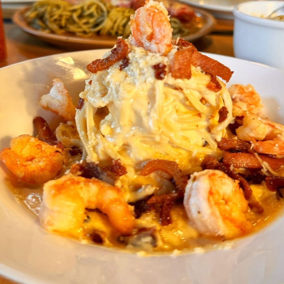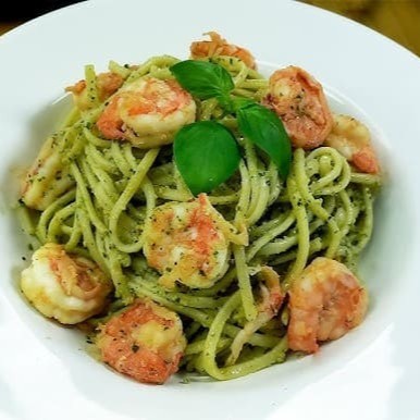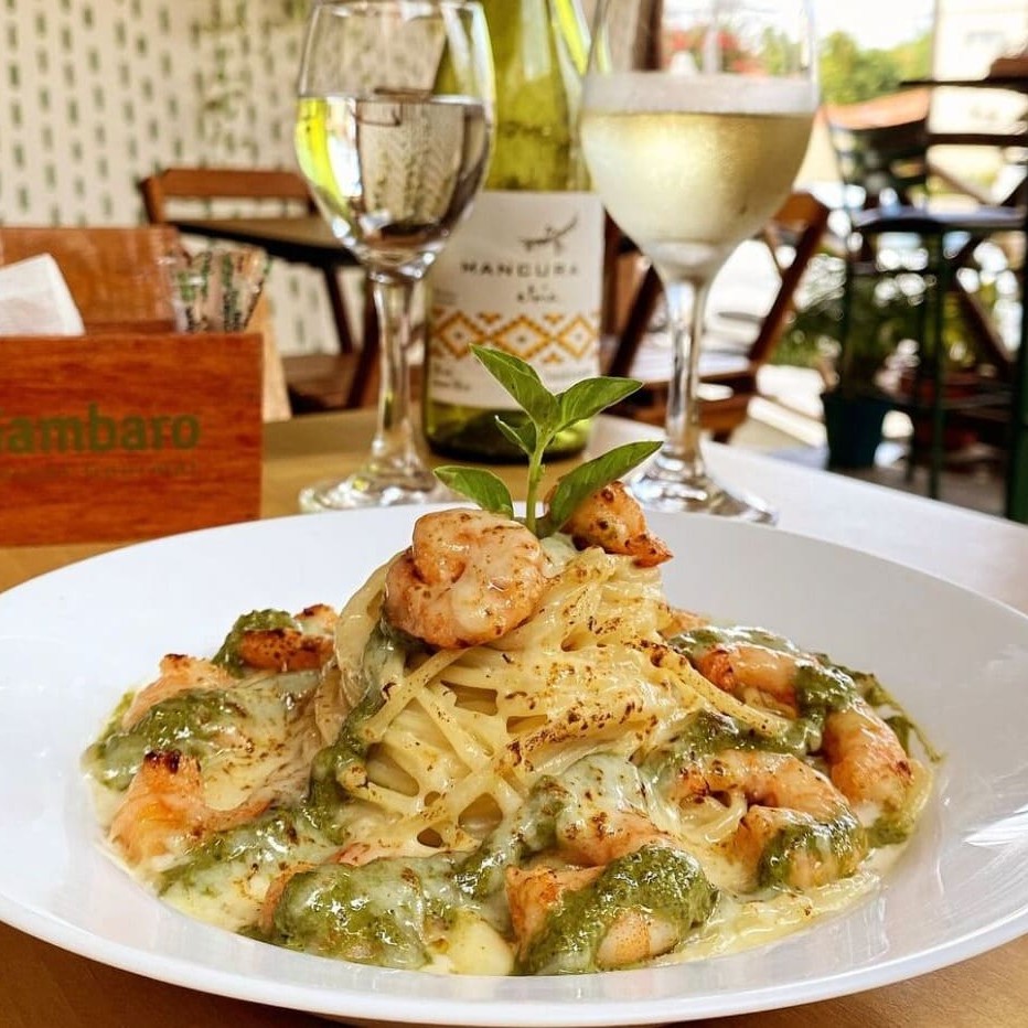 Cremoso spaghetti ao molho bechamel, servido com suculentos camarões, e finalização de muçarela gratinada com pesto artesanal da casa. Perfeito para duas pessoas.