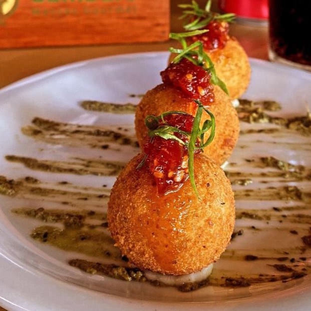 Deliciosos bolinhos de filé mignon feitos pela casa, recheados com filé mingon desfiado e chutney de abacaxi.