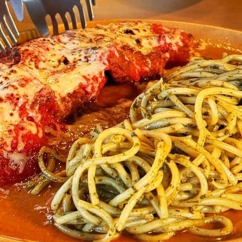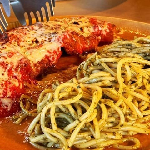 Delicioso Parmegiana de frango suculento e macio com tradicional molho de tomate artesanal, com a escolha de até 2 guarnições.
