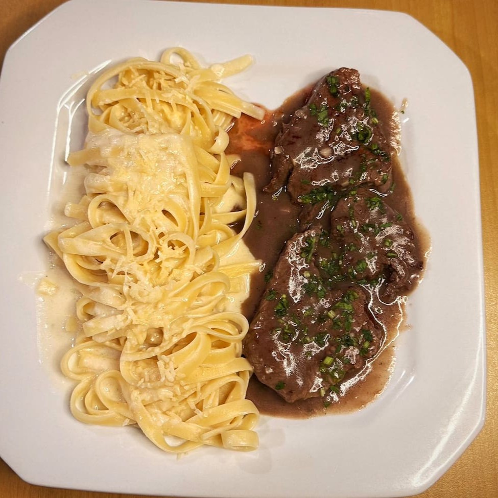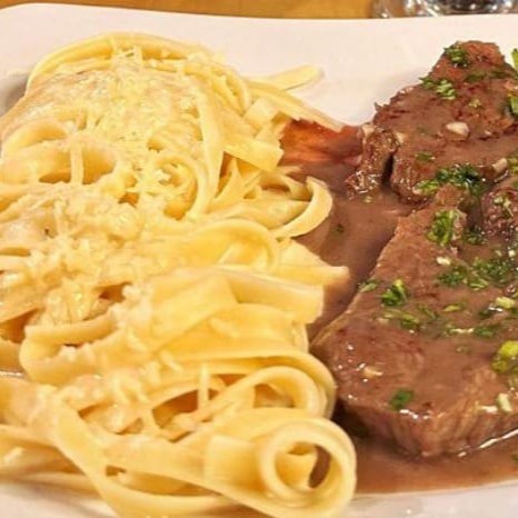 Fettuccine ao molho quatro queijos finalizado com parmesão, servido com escalopes de filé mignon ao molho madeira da casa.