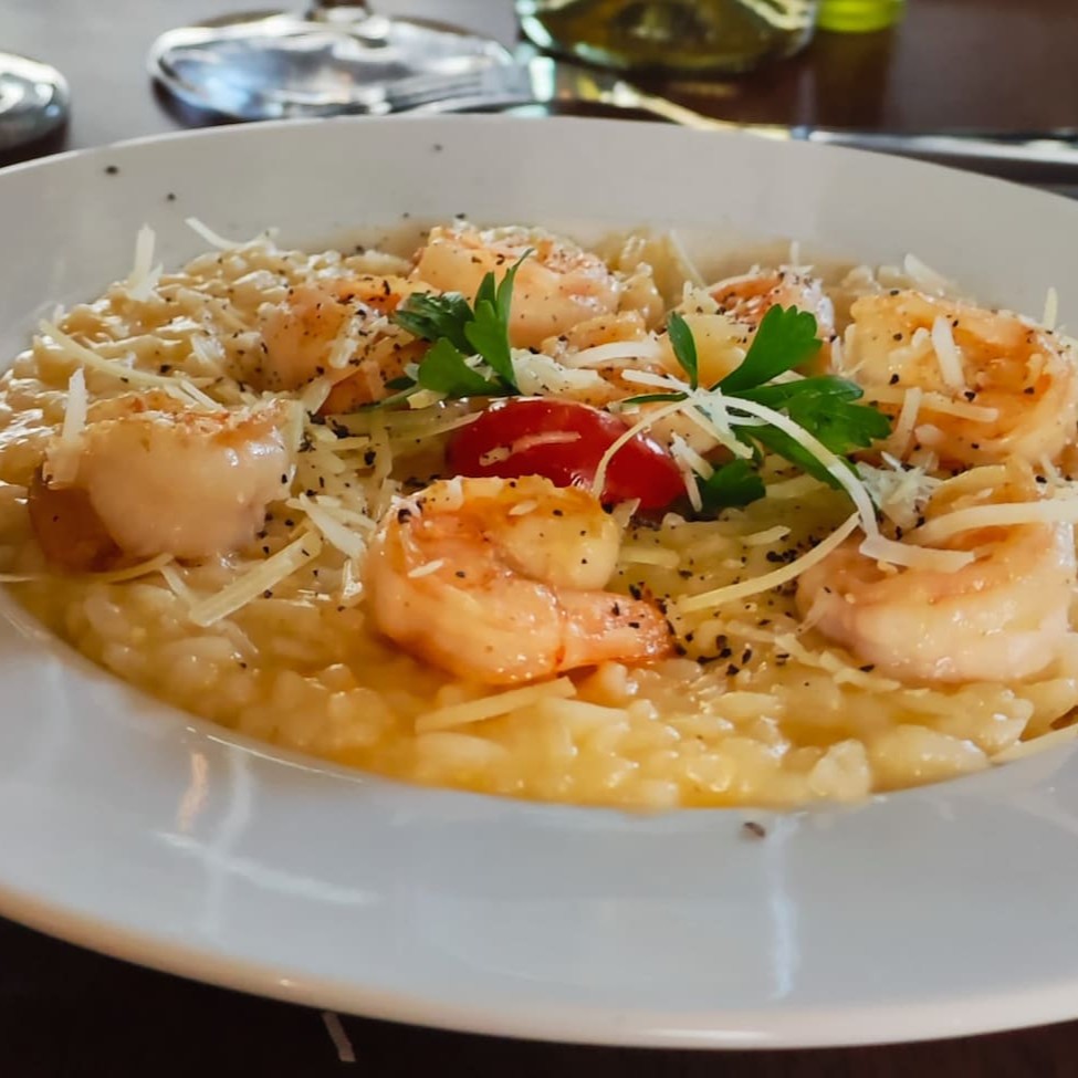 Cremosidade do arroz arbório servido com camarões flambados, queijo parmesão, raspas de limão siciliano, manteiga da fazenda, vinho branco e o toque final do tomate cereja.