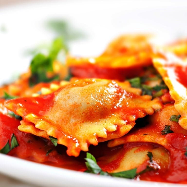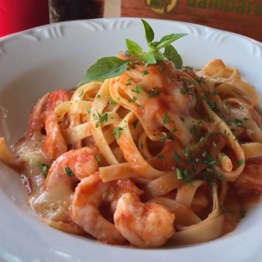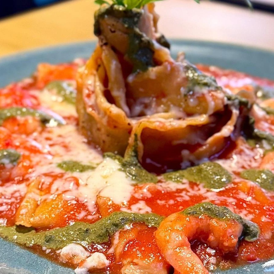 Suculenta massa fresca recheada com creme de camarão e servida com molho de tomate artesanal.